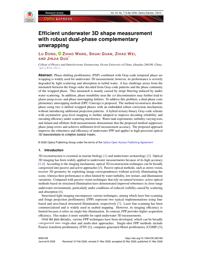 | Efficient underwater 3D shape measurement with robust dual-phase complementary unwrapping | ||